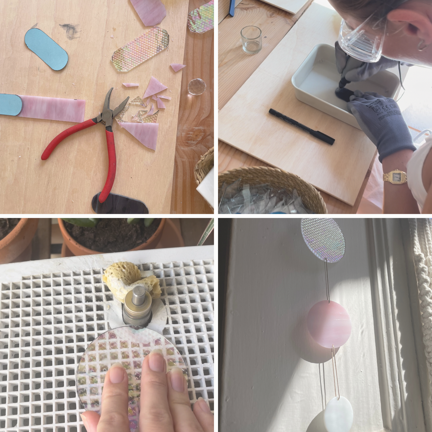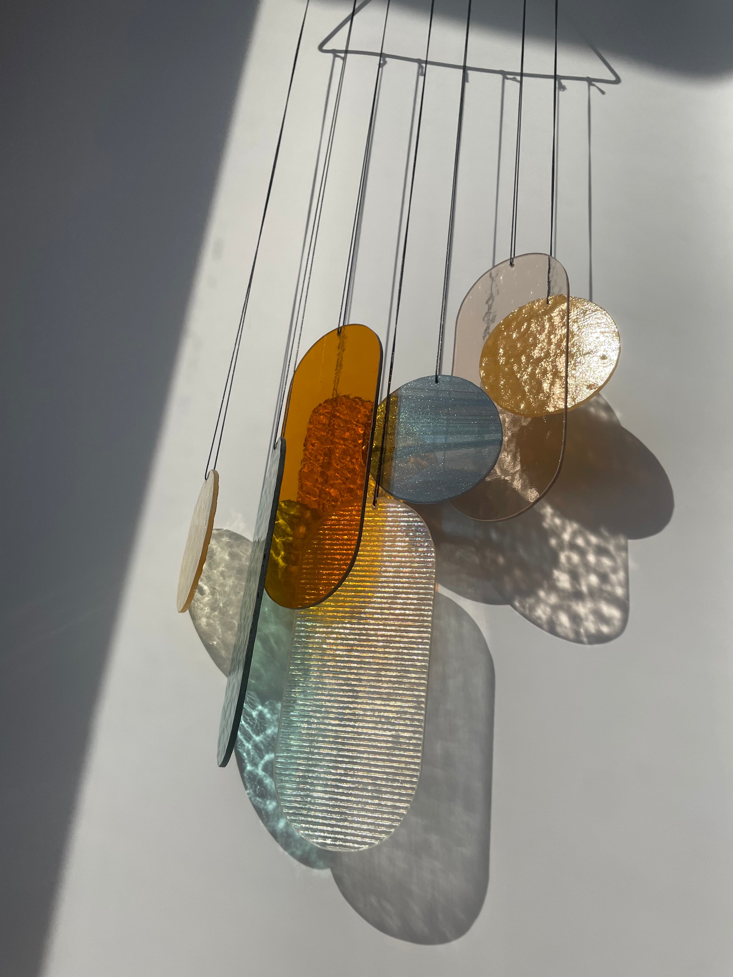 Mit einer eigens entwickelten Technik entstehen Wandbehänge und Sonnenfänger, die Räume auf besondere Weise in Szene setzen. Jedes Design vereint Form, Farbe und Transparenz – ein Zusammenspiel, das die Magie des Lichts einfängt und verstärkt.