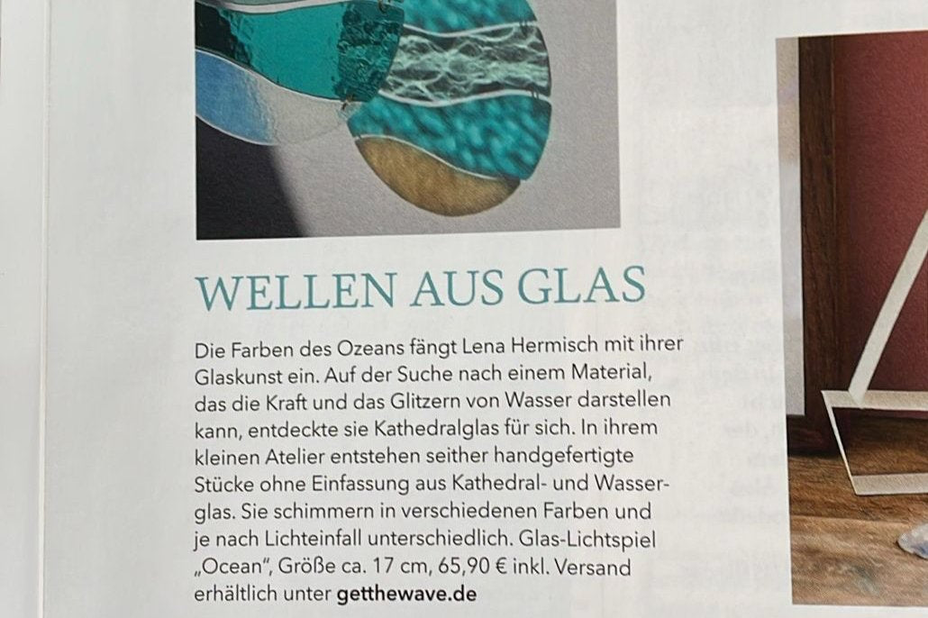 Mein Name ist Lena und ich bin autodidaktische Glaskünstlerin sowie Gründerin von GET THE WAVE. Vor fünf Jahren begann meine Reise auf Etsy – heute betreiben wir unseren Online-Shop und meine Werke sind in mehreren Concept Stores in Deutschland und Barcelona erhältlich.