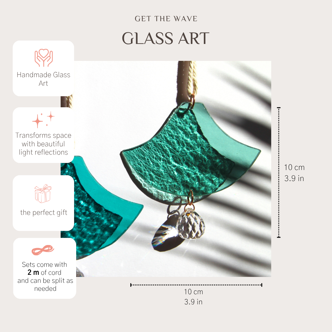 Der Wandschmuck wird in Handanfertigung aus Wasserglas, Kathedralglas und Irisierendes Glas hergestellt. Die Wellen haben jeweils eine Größe von 10 x 10 cm. Die Makrameekordel oder ein schwarzes Band sind inbegriffen und können selbst auf die benötigten Längen eingeteilt werden.