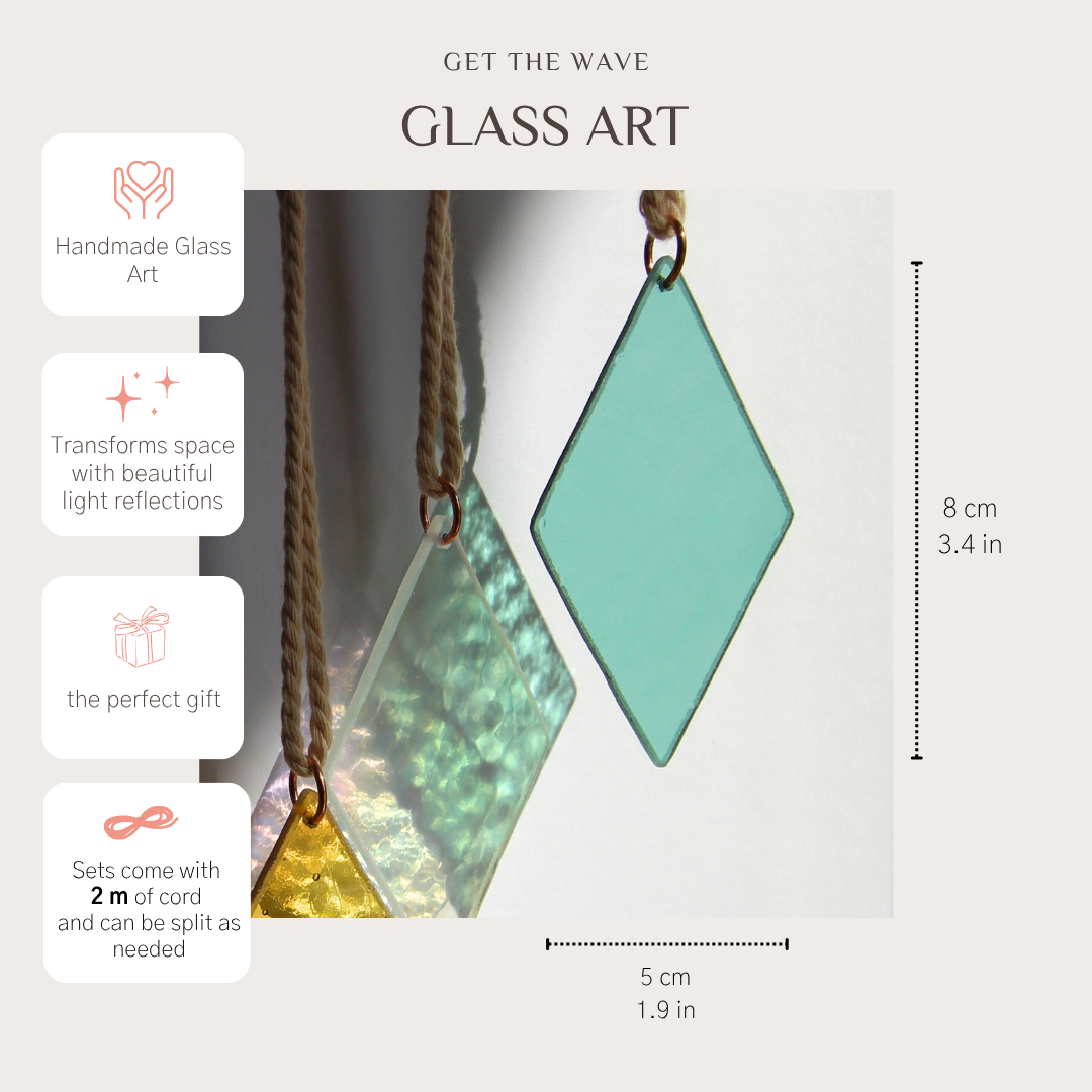 Der Wandschmuck wird in Handanfertigung aus Wasserglas, Kathedralglas und Irisierendes Glas hergestellt. Die Rauten haben jeweils eine Größe von 8 x 5 cm. Die Makrameekordel oder ein schwarzes Band sind inbegriffen und können selbst auf die benötigten Längen eingeteilt werden.