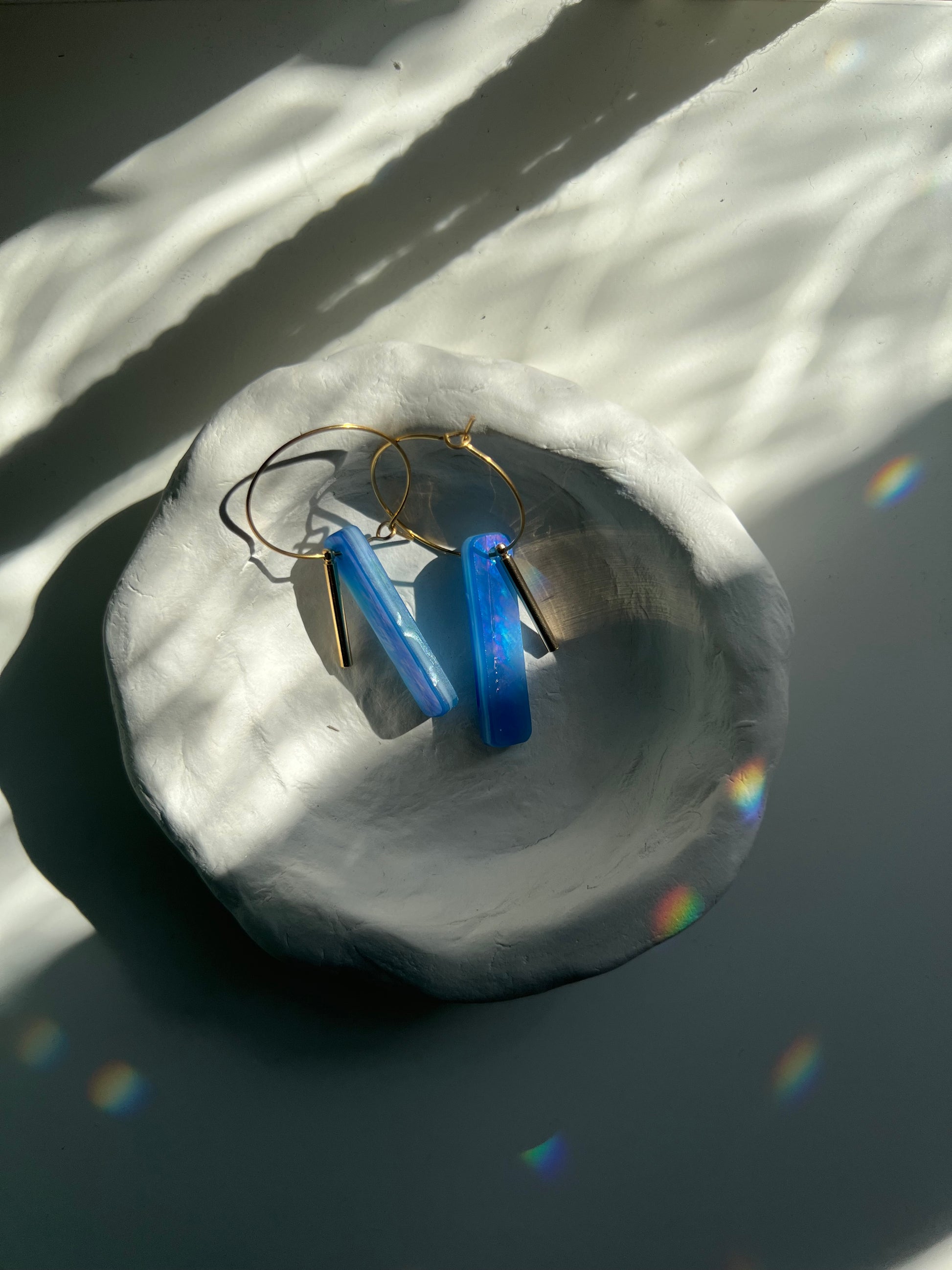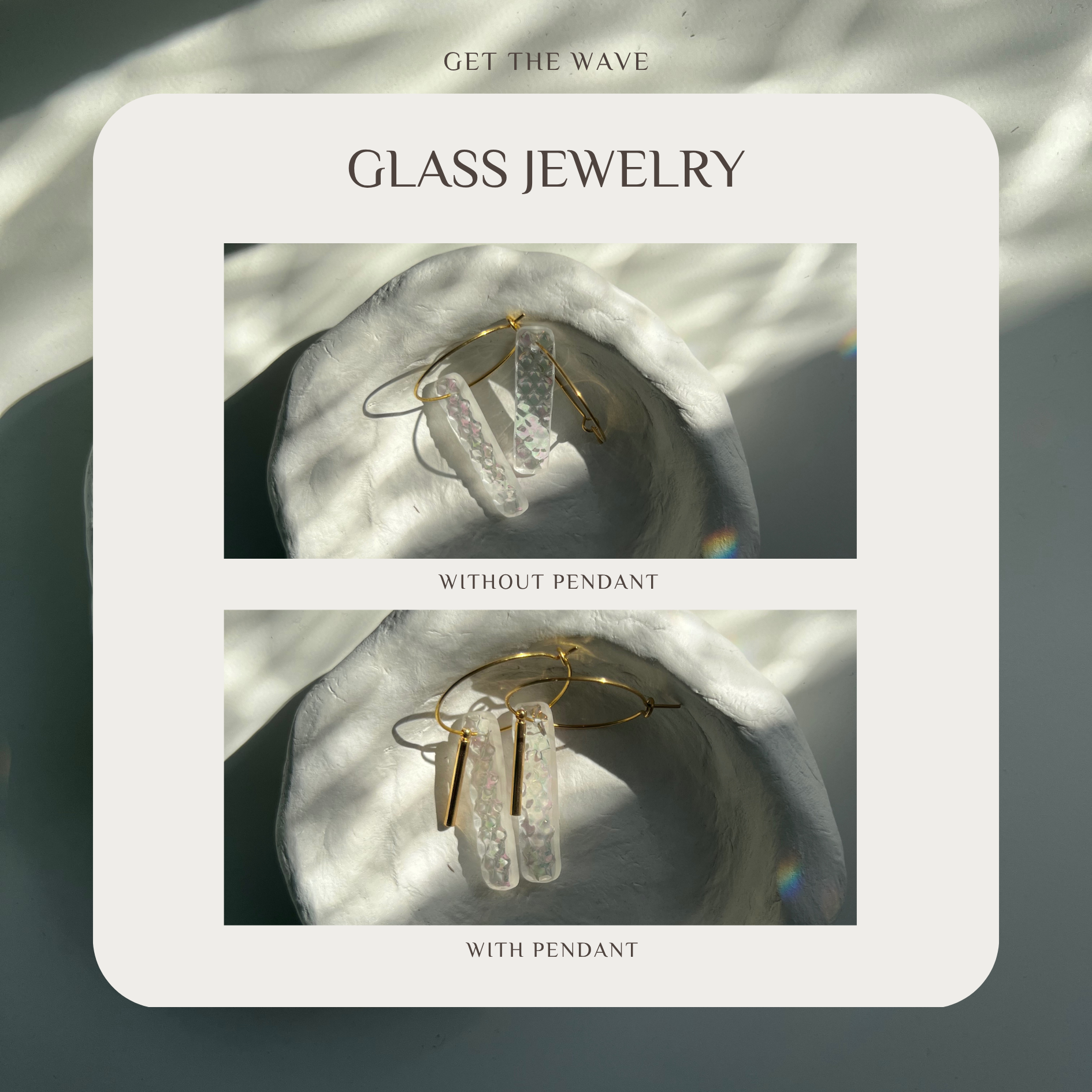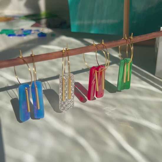 Jedes Glaselement wird in unserem Studio von Hand zugeschnitten und geschliffen. Die Creolen bestehen aus goldfarbenem Edelstahl.