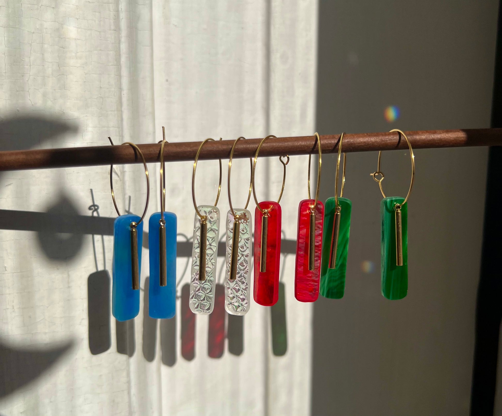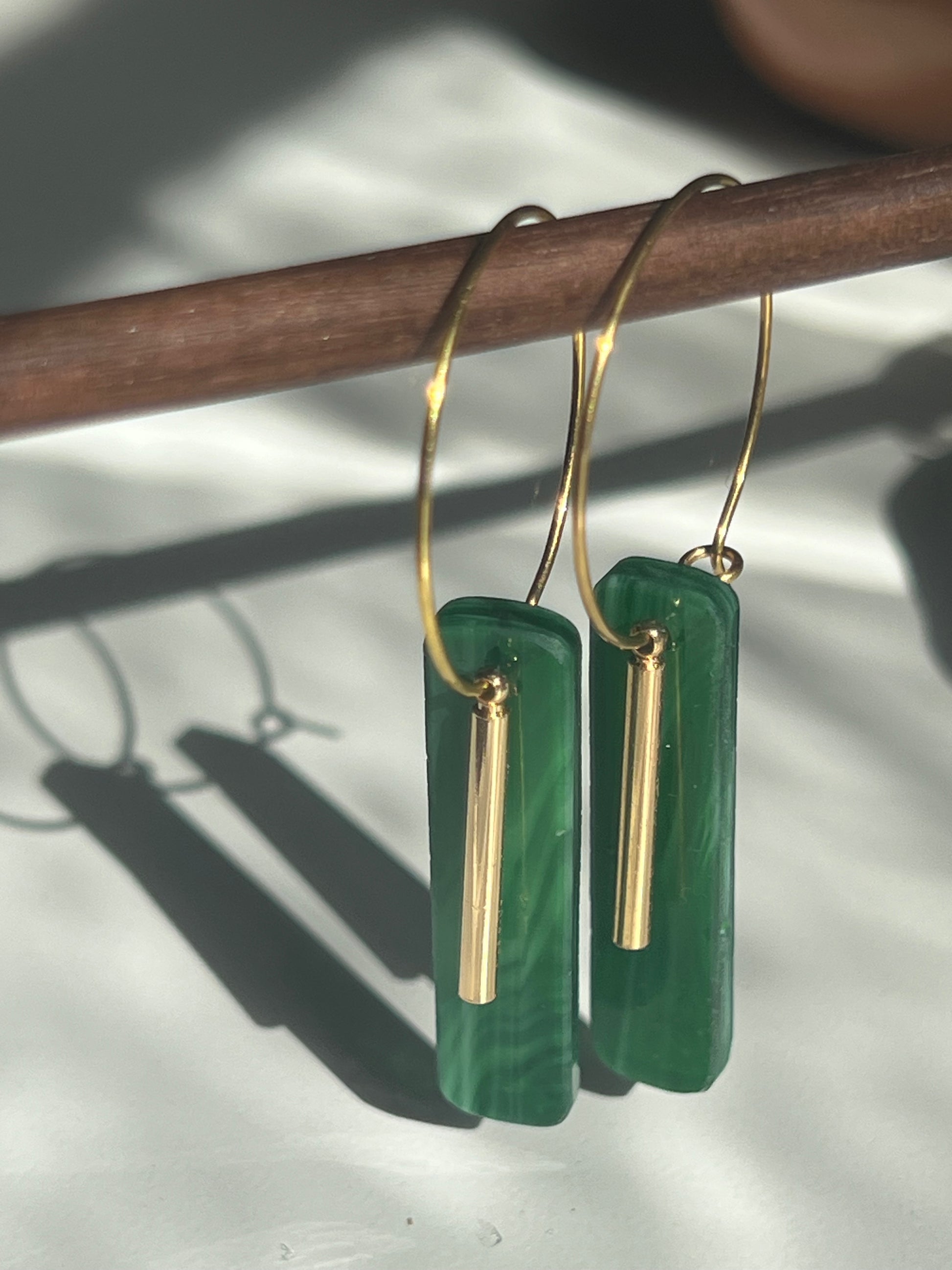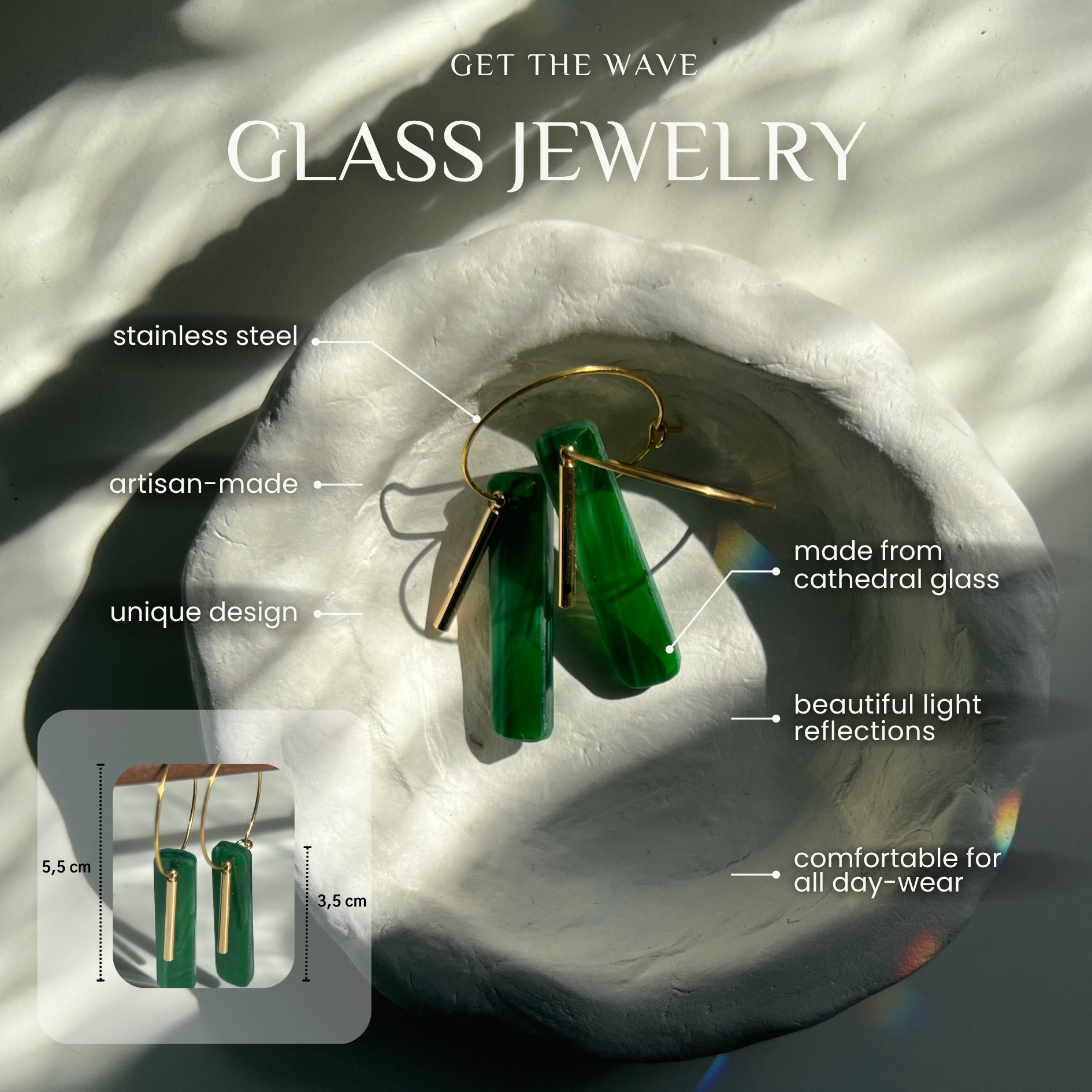 cathedral glass earrings, colorful glass jewelry, geometric earrings, handcrafted jewelry, artisanal jewelry, artistic accessories, gold and glass earrings, unique handmade gift, handmade gift for mom, iridescent earrings, gift for her birthday unique, emerald green earrings gold hoop, minimalistic earrings, rectangle earrings