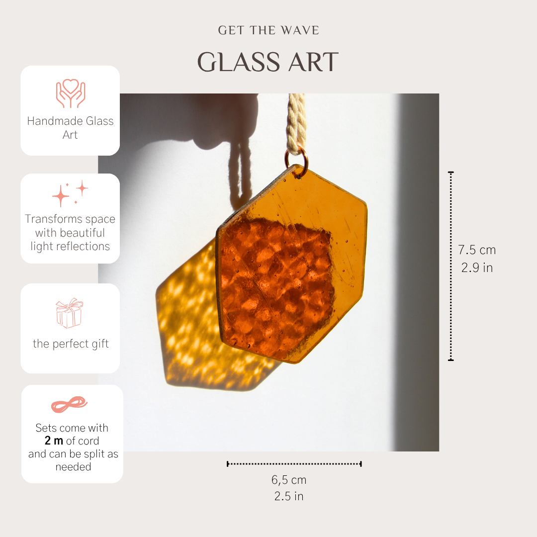 Die Anhänger funkeln wunderschön in der Sonne. Der Wandschmuck wird in Handanfertigung aus Kathedralglas und irisierendem Glas hergestellt. Die Anhänger haben jeweils eine Größe von 6,5 x 7cm. Die Makrameekordel oder ein schwarzes Band sind inbegriffen und können selbst auf die benötigten Längen eingeteilt werden.